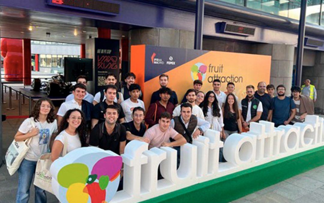 Un grupo de estudiantes del Grado en Ingeniería Agroalimentaria y Agroambiental y del Máster en Ingeniería Agronómica de la Escuela Politécnica Superior de Orihuela (EPSO) de la Universidad Miguel Hernández (UMH) han visitado la feria Fruit Attraction, celebrada en Madrid. Los estudiantes han estado acompañados por los profesores de la UMH Francisco Jiménez y Santiago García.