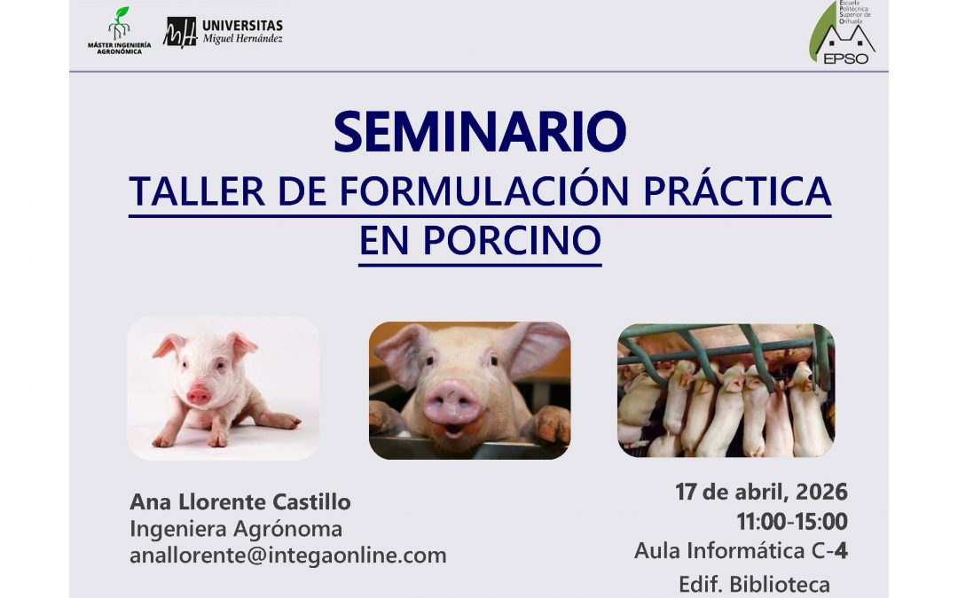 El viernes 17 de abril tendrá lugar el seminario titulado ««Taller de formulación práctica en porcino» a cargo de Ana Llorente Castillo.